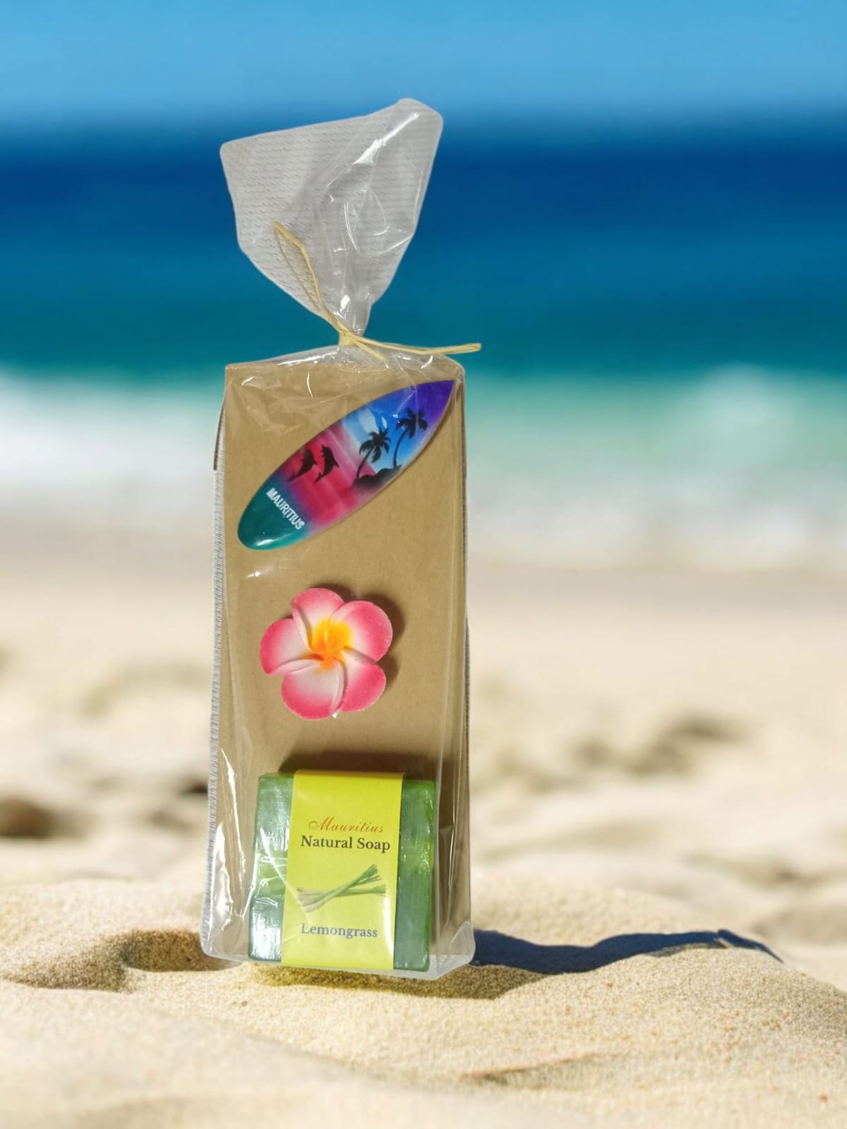 Découvrez notre charmant ensemble souvenir de l’île Maurice, parfait pour apporter une touche d’exotisme à votre quotidien ou à offrir en cadeau ! Cet ensemble comprend un petit savon aux délicieuses senteurs tropicales de l’île, accompagné d’une jolie petite fleur décorative et d’un magnet frigo en bois peint, un petit morceau d’artisanat local. Chaque élément de ce kit évoque la beauté et la douceur de Maurice. Le savon prend soin de vos mains avec ses parfums enivrants, la fleur ajoute une note de couleur et de gaieté, et le magnet décore votre réfrigérateur avec un motif unique. C’est un petit plaisir simple et authentique, idéal pour se rappeler de vacances inoubliables ou pour partager un peu du paradis mauricien. differents modeles planche a voile , dodo ou poisson suivant le stock .